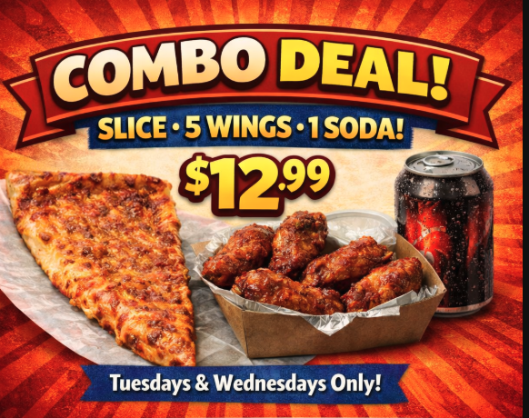 Only available in Cheese or Pepperoni includes 1 Order of Chicken Wings Hot or Mild + 1 Order of Cheesy Garlic Breadsticks. Available for pick-up only