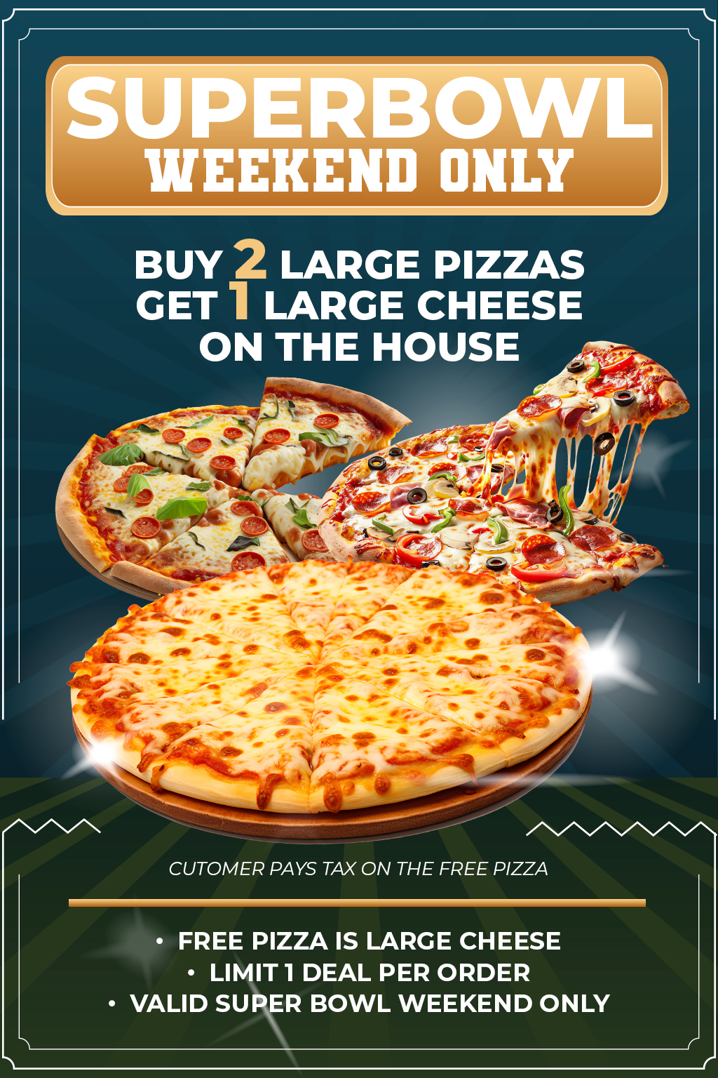 Get 1 Large Cheese Pizza free (tax only applies to free pizza)