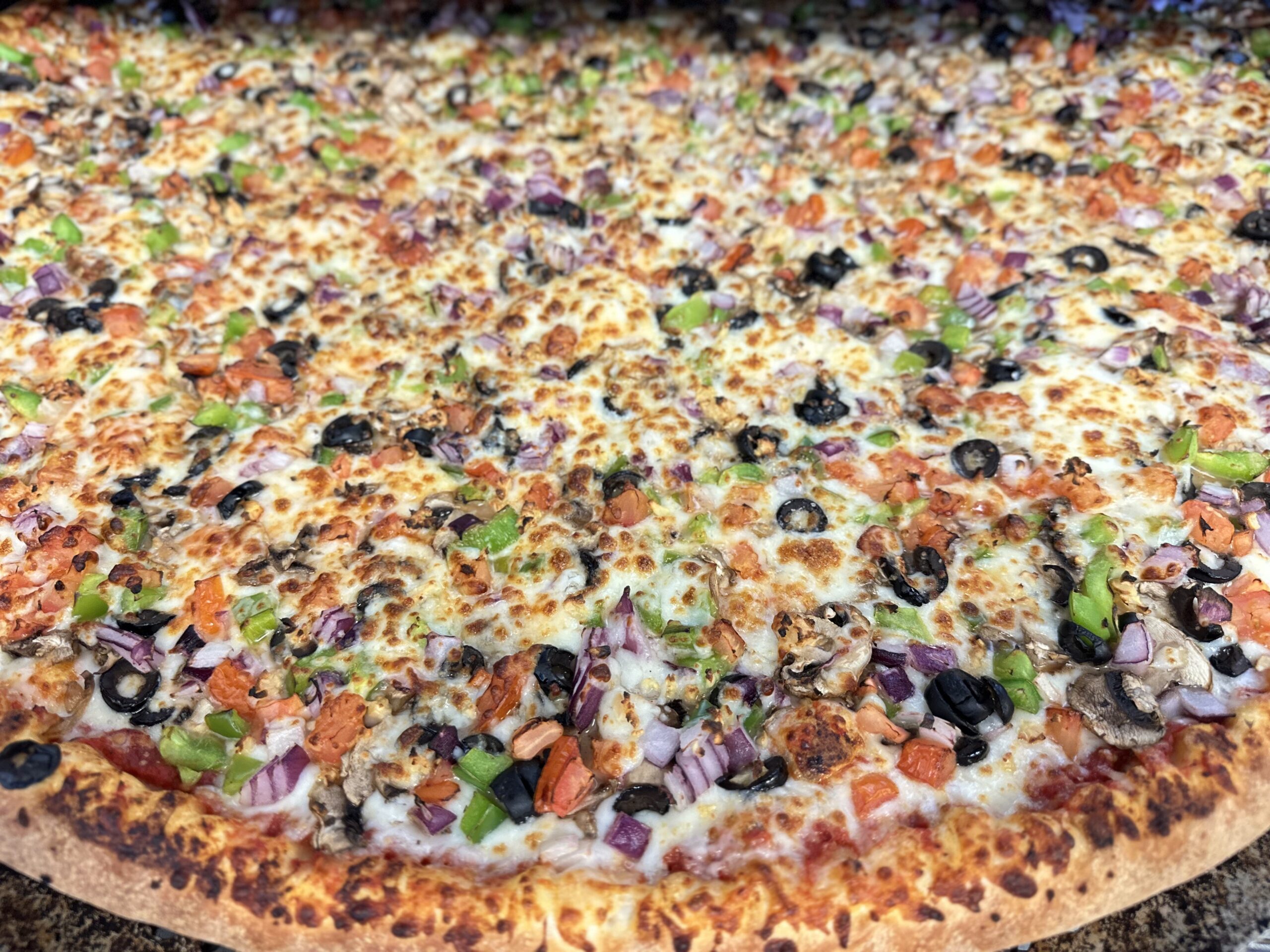 Mozzarella, mushrooms, onions, green peppers, black olives, tomatoes and garlic
